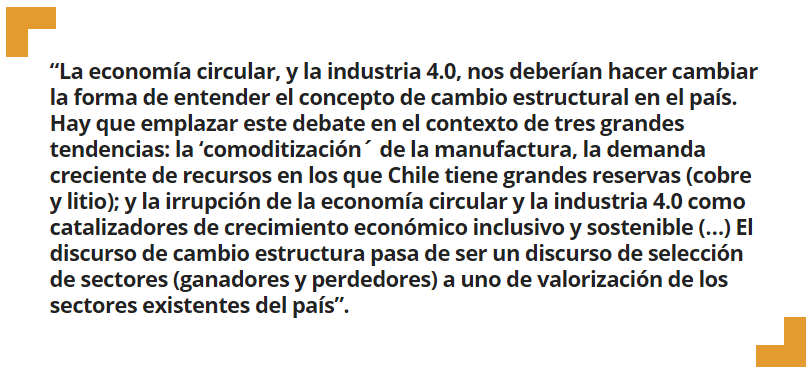La economía circular, y la industria 4.0, nos deberían hacer cambiar la forma de entender el concepto de cambio estructural en el país. Hace unos años el discurso giraba en torno a la dependencia de Chile del sector extractivo y la importancia de diversificarse hacia la manufacturera. Aunque esto sigue siendo relevante para Chile, tenemos que emplazar este debate en el contexto de tres grandes tendencias: la ´comoditización´ de la manufactura, cuyos precios están en bajos mínimos históricos; la demanda creciente de algunos recursos en los que Chile tiene grandes reservas (ejemplo cobre y litio); y la irrupción de la economía circular y la industria 4.0 como nuevos catalizadores de crecimiento económico inclusivo y sostenible. Por estos motivos, y desde mi humilde punto de vista, el discurso de cambio estructura pasa de ser un discurso de selección de sectores (ganadores y perdedores) a uno de valorización de los sectores existentes del país. A día de hoy me parecería imposible imaginar que Chile se desvinculara de esos sectores de alta demanda mundial, aunque estuvieran ligados a la minería o sector alimentos. Lo que me parece mucho más coherente es plantear cómo la economía circular y la industria 4.0 pueden hacer de Chile un líder mundial en innovación y competitividad en estos sectores.