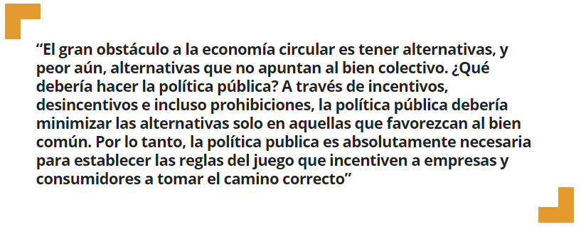Con el rol de la política en la economía circular hago siempre la misma reflexión. ¿Nos hemos parado a pensar donde funciona la circularidad de manera incuestionable? Funciona en un contexto de recursos limitados y pocas alternativas. Por eso la vemos aplicada en ambientes hostiles en nuestro planeta y como la única practica viable si algún día colonizamos otro planeta. El gran obstáculo a la economía circular es tener alternativas, y peor aún, alternativas que no apuntan al bien colectivo. ¿Qué debería hacer la política pública? A través de incentivos, desincentivos e incluso prohibiciones, la política pública debería minimizar las alternativas solo en aquellas que favorezcan al bien común. Por lo tanto, la política publica es absolutamente necesaria para establecer las reglas del juego que incentiven a empresas y consumidores a tomar el camino correcto. Por ejemplo, hoy ya somos conscientes de la importancia del diseño para extender la vida útil de los productos y minimizar la generación de residuo. Instrumentos como apoyar el I+D en diseño sostenible o la imposición de una certificación de diseño sostenible son ejemplos de como la política pública puede tener un rol significativo.