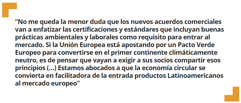 Hay dos grandes líneas que creo van consolidar la agenda de economía circular en la región. El financiamiento a través del Fondo Mundial para el Medio Ambiente (GEF en inglés) y el Fondo Verde del Clima (GCF en inglés) ya están empezando a priorizar la economía circular en sus programas. El Centro y Red de Tecnología del Clima (CTCN en inglés) está apoyando a muchos países de la región a desarrollar sus hojas de ruta en economía circular. Sin ir más lejos, Chile, Brasil, México y Uruguay ya están recibiendo asistencia técnica. Esto significa que el tema está en las agendas de los donantes. El segundo aspecto tiene que ver con los requisitos cada vez más exigentes de los mercados internacionales para la comercialización de bienes y servicios. No me queda la menor duda que los nuevos acuerdos comerciales van a enfatizar las certificaciones y estándares que incluyan buenas prácticas ambientales y laborales como requisito para entrar al mercado. Si la Unión Europea está apostando por un Pacto Verde Europeo para convertirse en el primer continente climáticamente neutro, es de pensar que vayan a exigir a sus socios compartir esos principios. En ese sentido estamos abocados a que la economía circular se convierta en facilitadora de la entrada productos Latinoamericanos al mercado europeo.