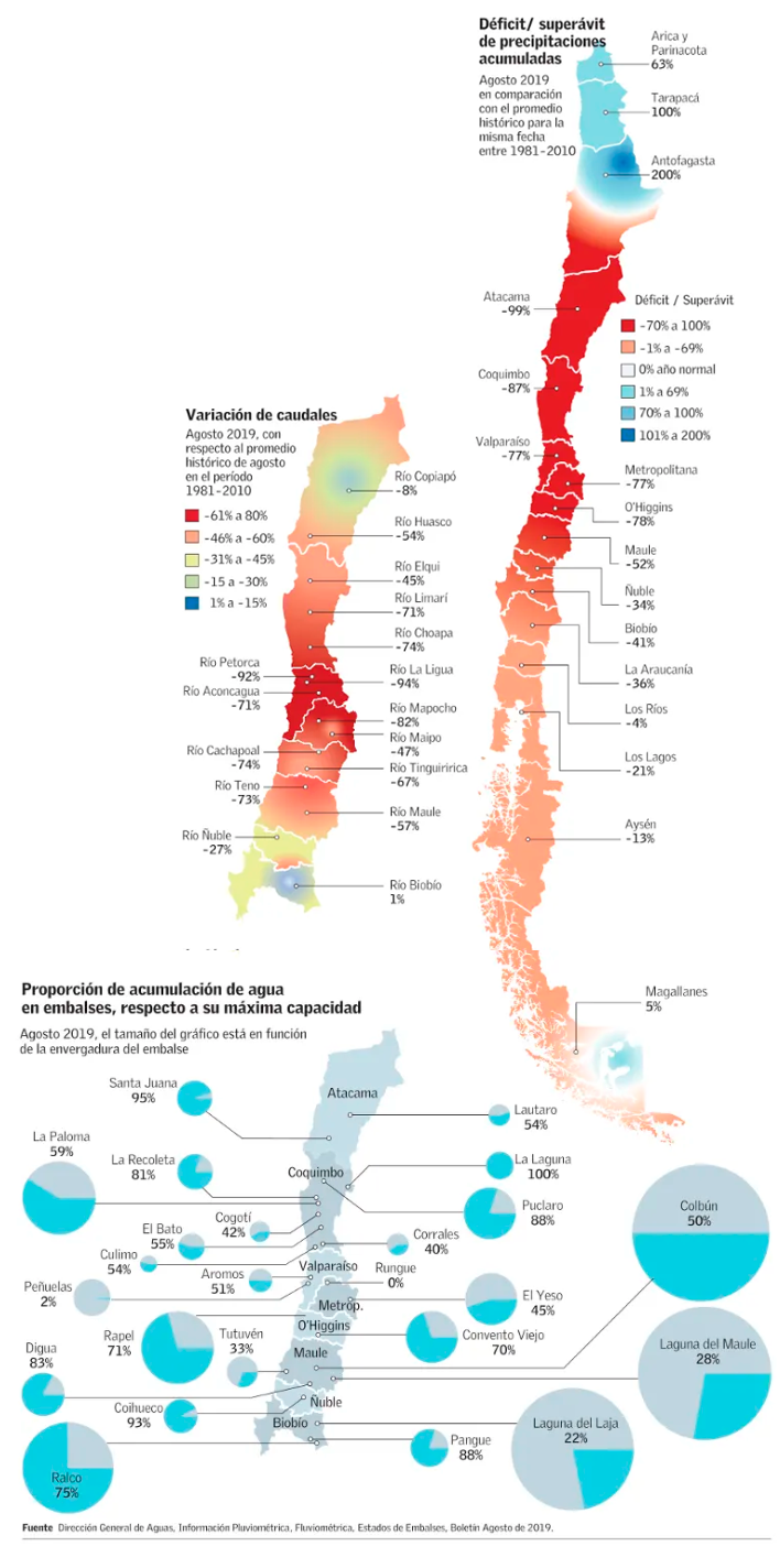 Los datos contenidos en el informe muestran que a excepción de los extremos norte y sur del país, entre las regiones de Atacama hasta Aysén las precipitaciones acumuladas a agosto, en comparación con el promedio histórico para la misma fecha entre los años 1981 y 2010, registran importantes déficits, siendo el mayor el que evidencia Atacama, con un -99% (ver infografía). Incluso en la zona sur de Chile, donde tradicionalmente llueve en abundancia, también hay déficits. “Llama la atención lo que ocurre en la zona sur del país, donde, por ejemplo, en Biobío las precipitaciones actuales comparadas con su promedio histórico registran un déficit de -41%, en La Araucanía es de un -36% y en Los Lagos de -21%, lo que es un déficit relevante para esas zonas”, comenta Rodrigo Weisner, exdirector de la DGA y socio de Puga Ortiz Abogados.