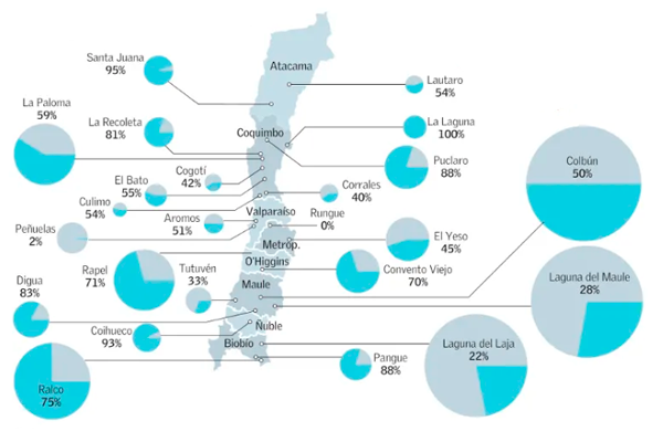 Actualmente, los embalses están almacenando solo un 42% de su capacidad total. De los embalses más grandes, el Colbún registra una acumulación de agua del 50%, mientras la laguna del Maule tiene solo un 28% de acumulación de agua respecto de su capacidad máxima, y la laguna del Laja llega a un 22%. De menor capacidad, pero en una situación más crítica se encuentra el embalse Peñuelas, con apenas un 2% de acumulación de agua. Los de tamaño mediano se encuentran por encima de la media, como el Yeso, cuya acumulación de agua alcanza un 45% y La Paloma, con un 59% de su capacidad.
