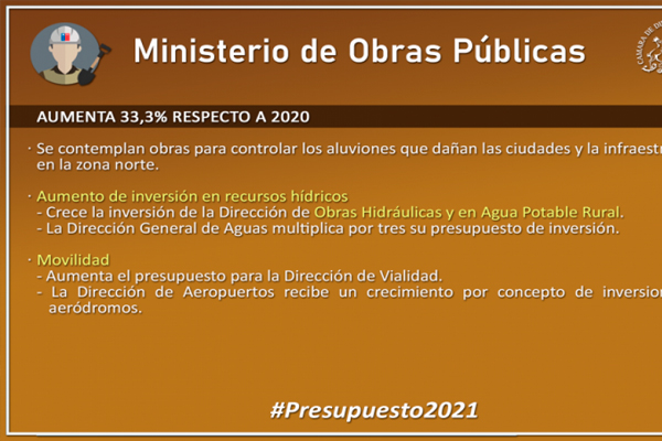 En condiciones de pasar a trámite al Senado quedó la partida destinada al Ministerio de Obras Públicas, luego que la Sala ratificara sus recursos en el marco del proyecto de la Ley de Presupuestos para el año 2021 (boletín 13820).