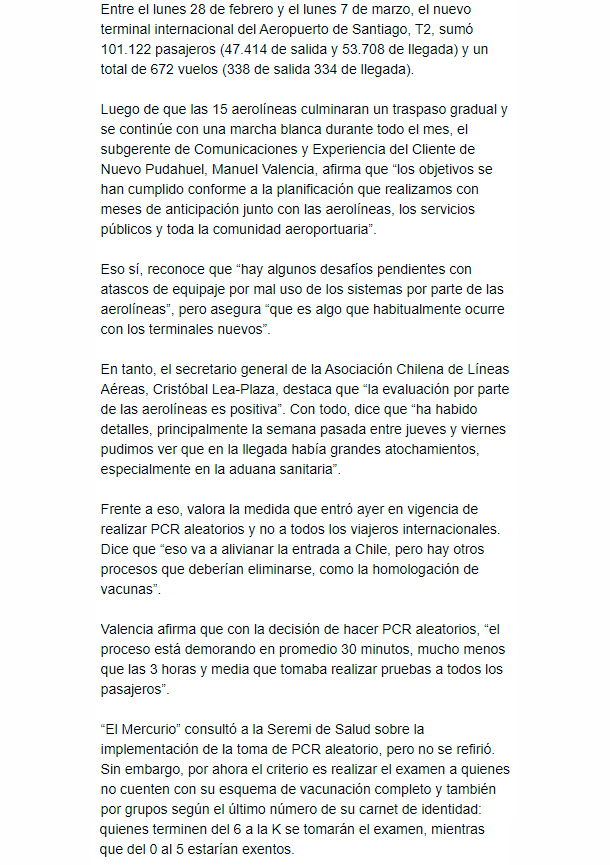 EL MERCURIO – A más de una semana de inaugurado operaron 672 vuelos. Ayer también comenzó la toma de PCR aleatorio.
