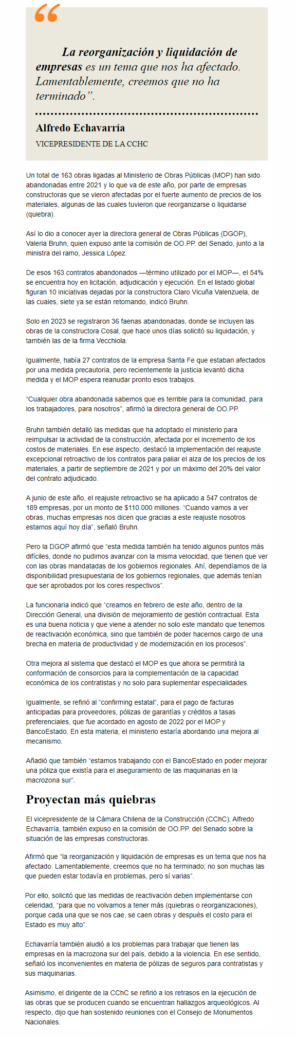 EL MERCURIO – En el listado figuran obras de las empresas Claro Vicuña Valenzuela; Cosal y Vecchiola. La CChC estima que quiebras de firmas no han terminado.