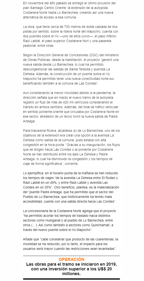 EL MERCURIO – La obra, que tiene cerca de 700 metros de doble calzada de dos pistas por sentido, sobre la ribera norte del Mapocho, cuenta con dos puentes sobre el río -uno de ellos curvo-, el paso inferior Raúl Labbé, el paso superior Costanera Norte y una pasarela peatonal, entre otras.