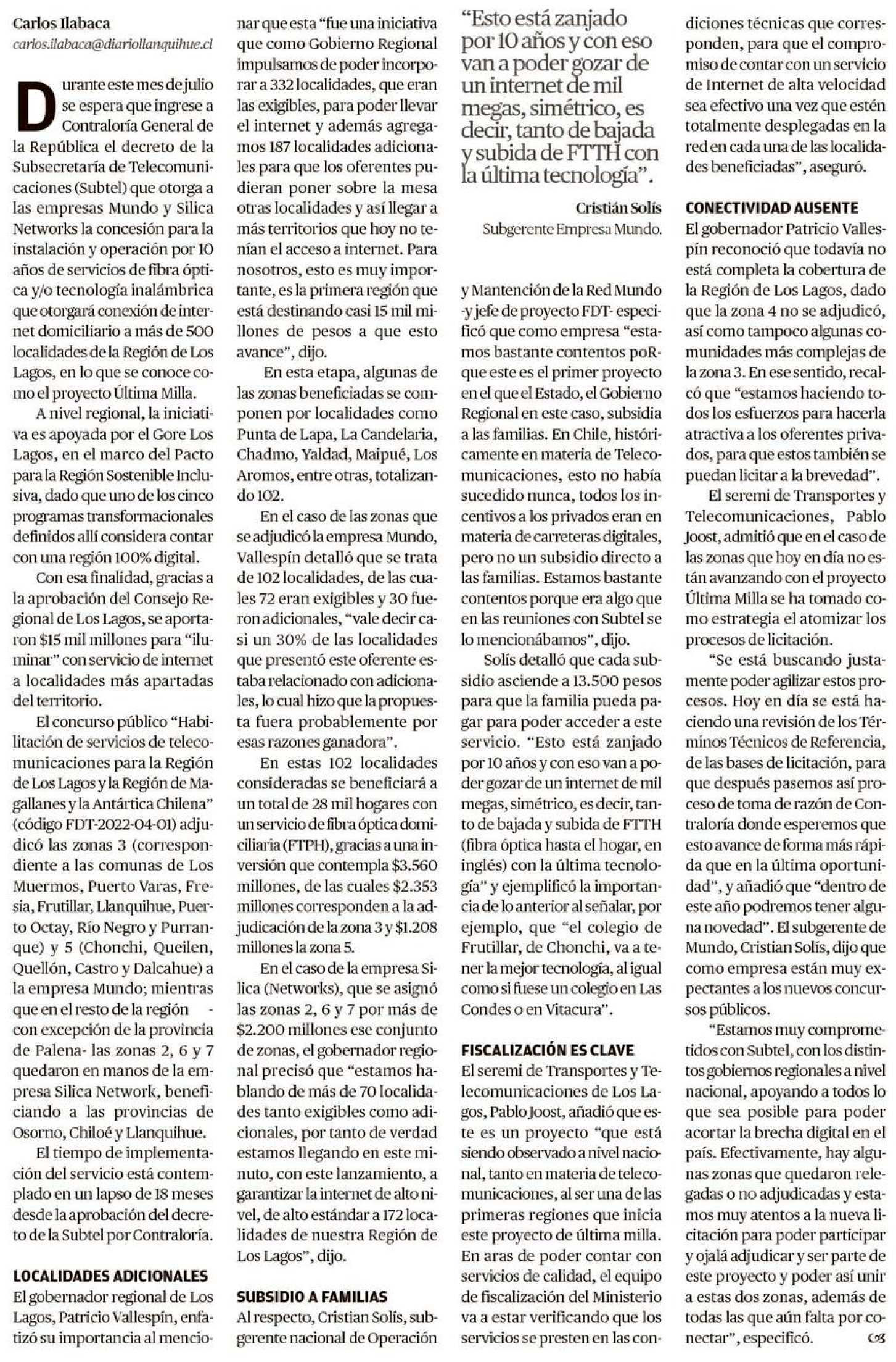 EL AUSTRAL DE OSORNO – Este mes ingresará a la Contraloría el decreto de Subtel que otorga la concesión por 10 años. Subsidio por hogar llegará a $13.500