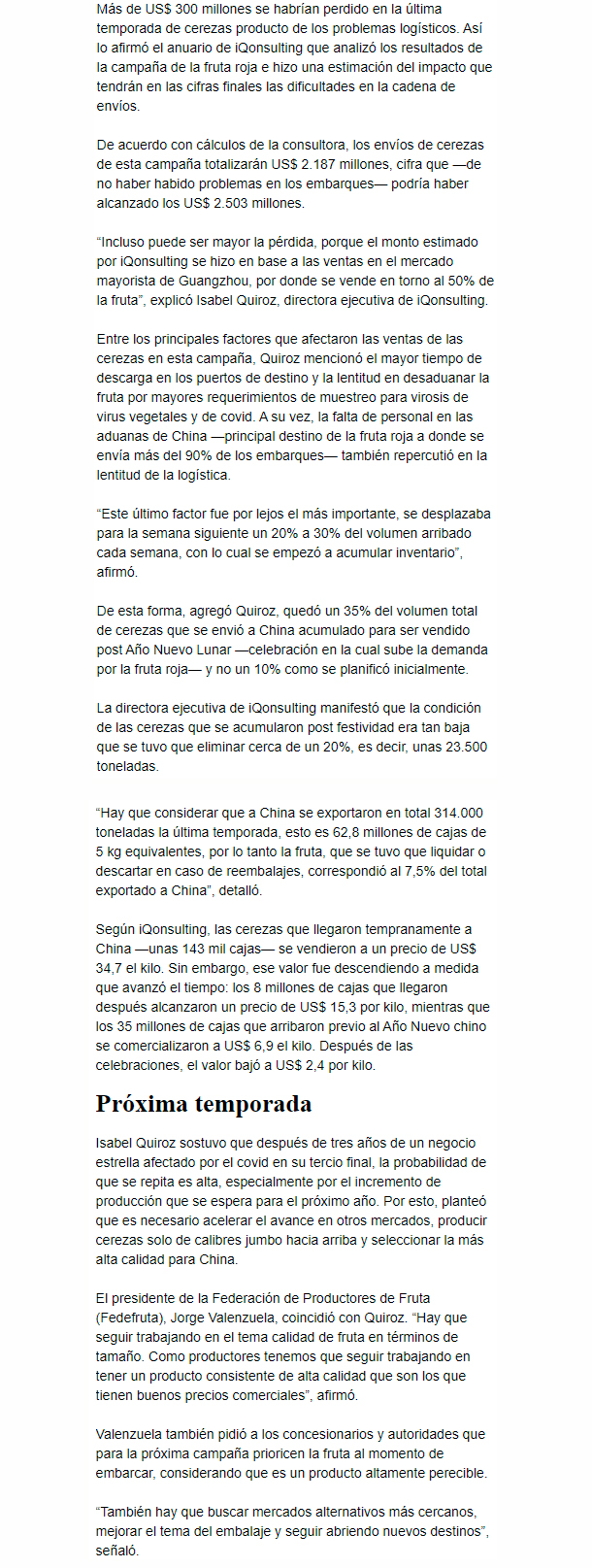 EL MERCURIO – Cerca de un 7,5% del volumen total de la fruta enviada a China se tuvo que liquidar o eliminar por malas condiciones.