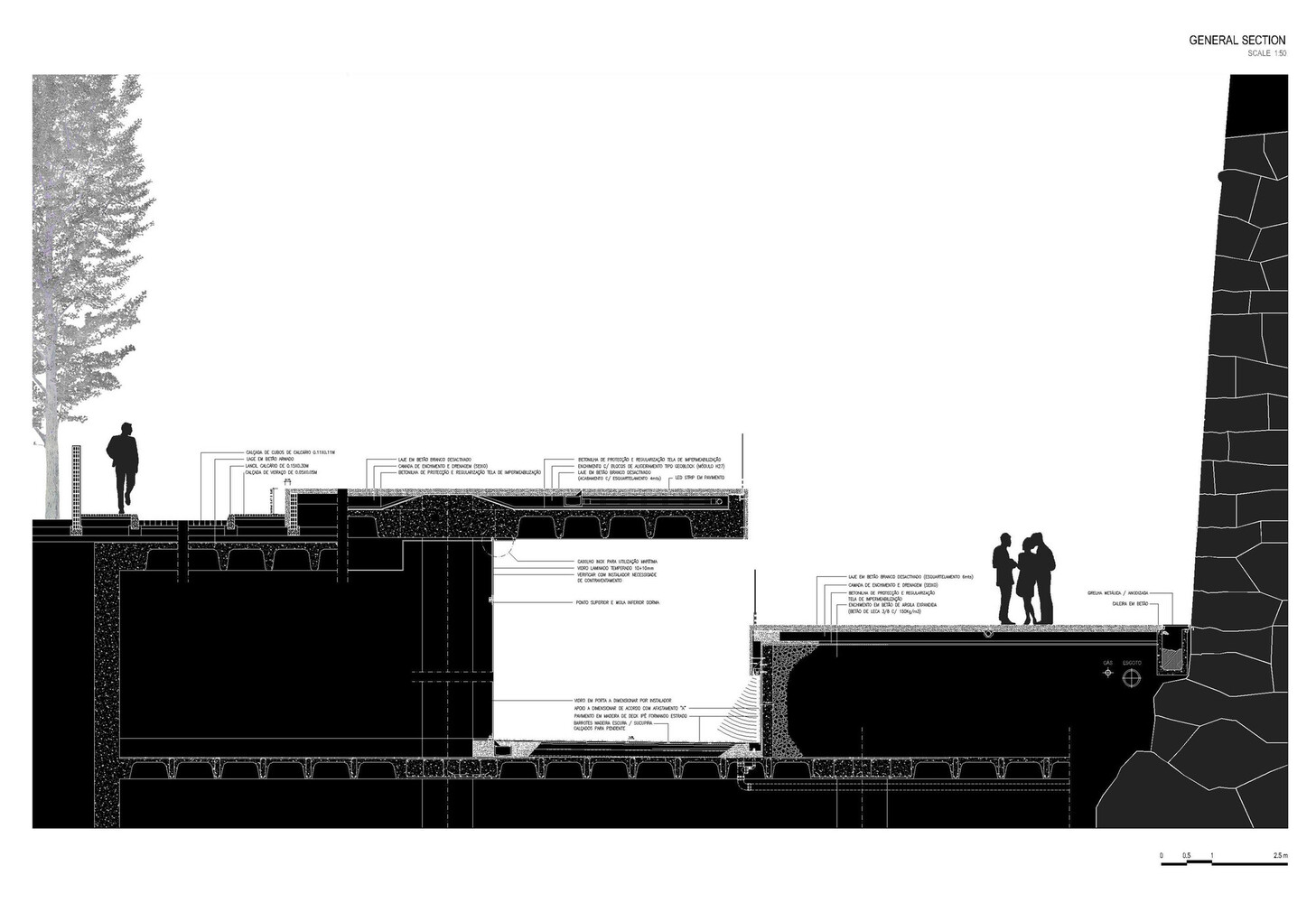 “El plan de tratamiento exterior de la zona de estacionamientos en la Plaza D. Diogo de Menezes en Cascais, se proyecta como una plataforma de superficie de techo con los volúmenes que conectan con el interior del aparcamiento subterráneo.”