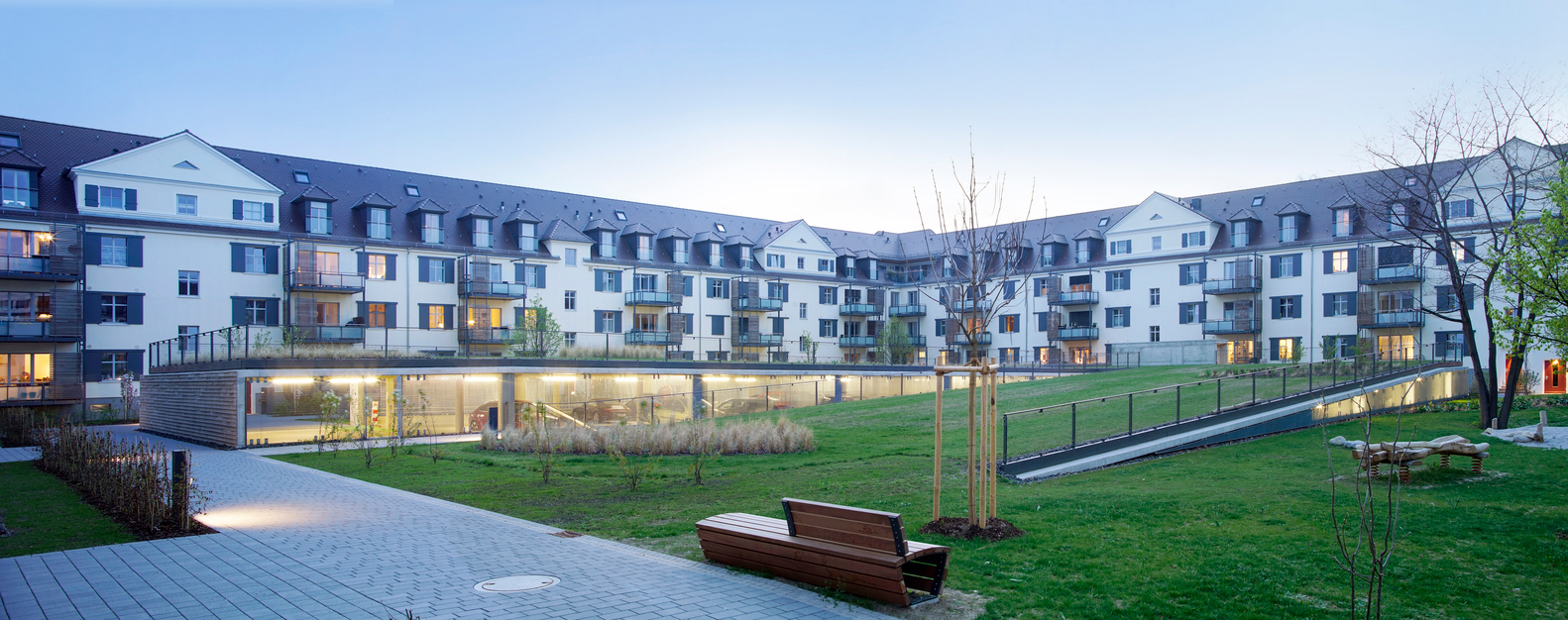 “Como un paisaje de techo a ras de suelo, la plataforma de estacionamiento se destaca del patio interior del complejo de edificios históricos Hohenzollernhöfe. Las rampas de estacionamiento abiertas parcialmente, giran hacia abajo en tres niveles.