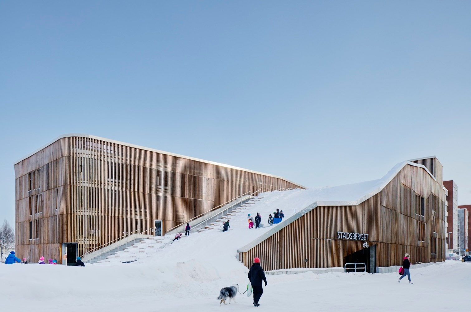 “El garaje de cinco plantas de estacionamiento tiene capacidad para 228 espacios de aparcamiento, pero dentro sus otras funciones se convirtió en el lugar de reunión de la ciudad. Durante el verano sirve como un lugar de encuentro popular con exuberante vegetación y flores plantadas en la colina. La pendiente está diseñada como un anfiteatro donde la gente puede disfrutar del sol de la tarde y ya ha sido utilizado para eventos musicales, por ejemplo. Pero a medida que la nieve cae, se convierte en una pendiente que deleita a los niños y adultos con un trineo o una taza de chocolate caliente en la escalera.”