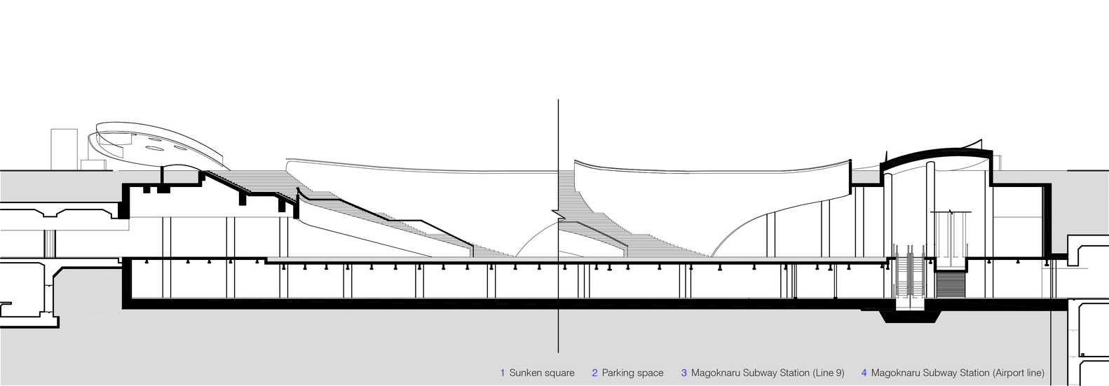 “La plaza es un espacio urbano flexible capaz de acomodar estos servicios, respondiendo al movimiento de personas en los alrededores en lugar de ofrecer un programa fijo. El cuadrado hundido de 60 m de diámetro está construido en la unión de las tres estaciones, tejiendo la superficie y los niveles subterráneos a lo largo de las salidas de la estación, creando una experiencia espacial. La plaza abierta puede acomodar diversas actividades como eventos, espectáculos y exposiciones.”