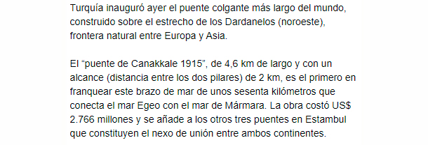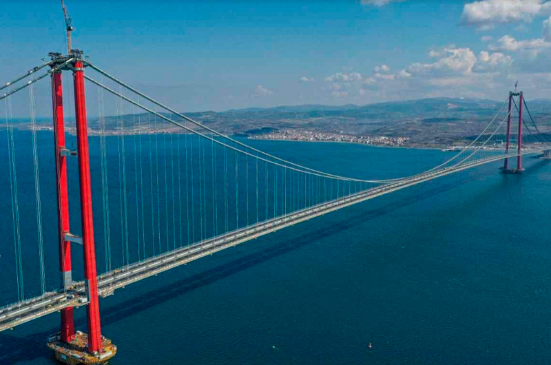 EL MERCURIO – Turquía inauguró el puente colgante más largo del mundo, construido sobre el estrecho de los Dardanelos, de 4,6 km de largo.