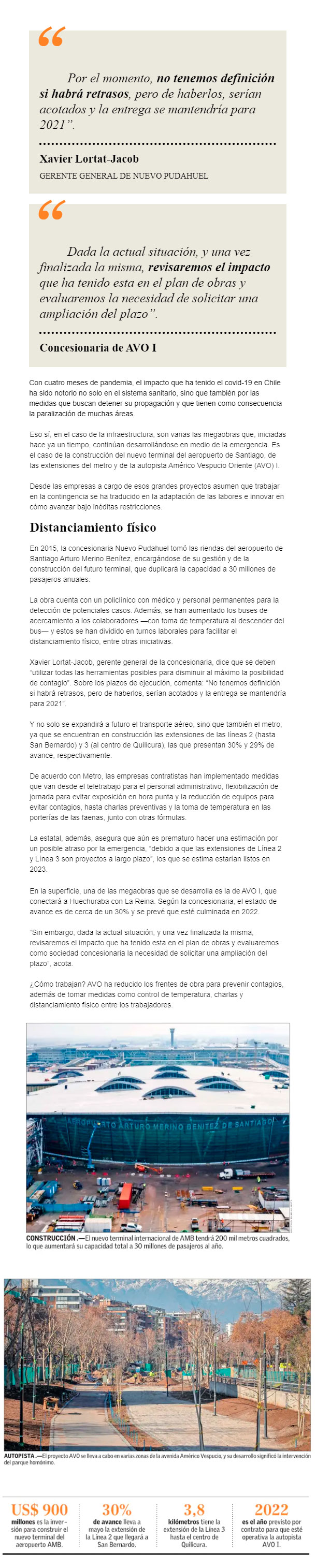 EL MERCURIO – El terminal internacional del aeropuerto de Santiago, la autopista Américo Vespucio Oriente y las extensiones del metro han tenido que adaptarse a la contingencia.