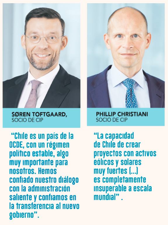 En su primera entrevista con un medio chileno para abordar los detalles de la inversión, los principales socios del CIP, Søren Toftgaard y Phillip Christiani, afirman que escogieron al país por su perfil político y medioambiental, y por su estrategia nacional de HV.