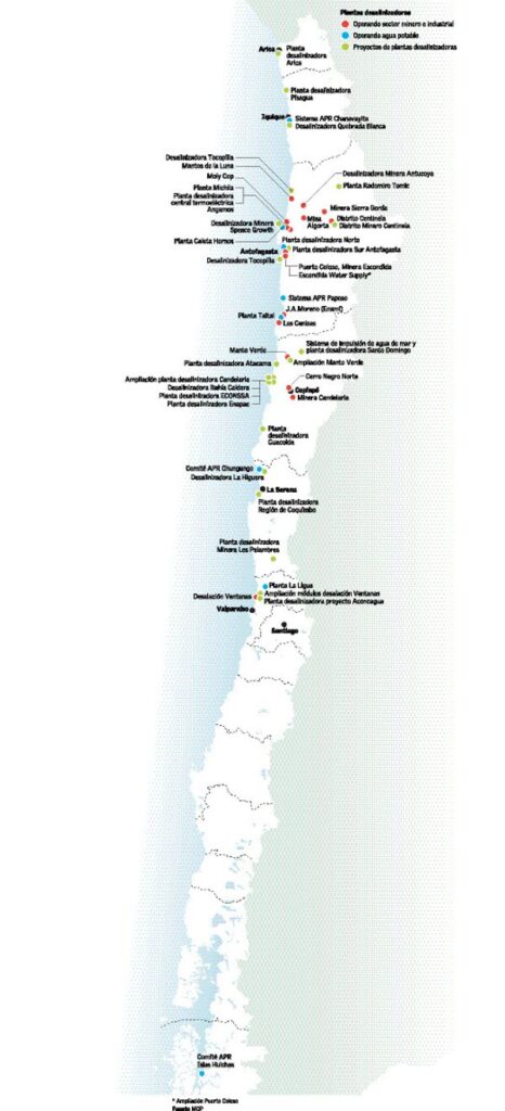 Actualmente, en Chile se producen 5.570 litros de agua por segundo a partir de agua de mar. En los próximos cinco años, esa cifra crecerá en 160%, a 14.468 litros de agua por segundo, más del doble del caudal promedio del río Mapocho en un año normal. Según un catastro recopilado por el Ministerio de Obras Públicas, en todo el país operan 24 plantas desalinizadoras y sistemas de impulsión de agua de mar, y hay otros 22 proyectos en diferentes etapas de desarrollo.