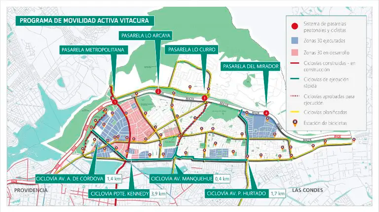 La iniciativa forma parte del Programa de Movilidad Activa de Vitacura, el cual considera Zonas 30, el sistema de bicicletas públicas, la red de ciclovías y pasarelas para peatones y ciclistas. Galo Errázuriz, jefe de gabinete del municipio, explicó que “las obras de la primera etapa estarán listas en noviembre de este año, mientras que todo el circuito debería estar operativo durante el segundo semestre de 2021”.
