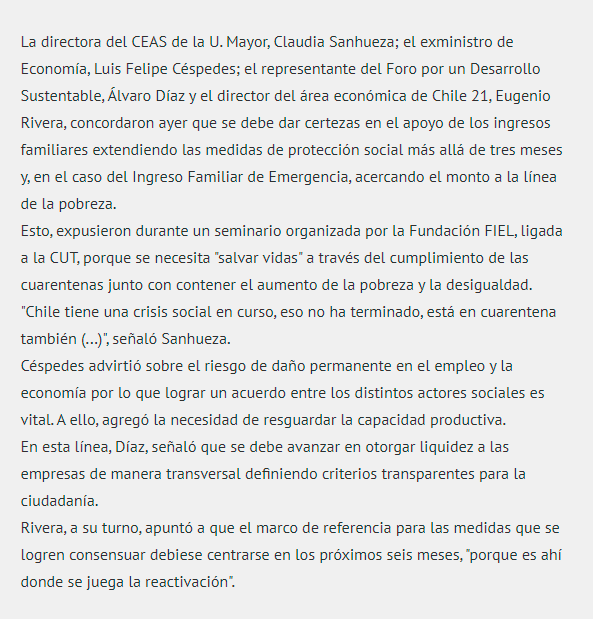 “Cuando después uno tiene una mirada transversal, hay que ver cómo aportamos en indicadores y temas que son importantes para el país en este momento, como empleo, inversión, impacto social de las medidas y mantención de las empresas. Acá el país tiene que mantener su capacidad productiva activa para el momento de la reactivación, esos son indicadores objetivos a los cuales esperamos apuntar”, dijo Donoso.