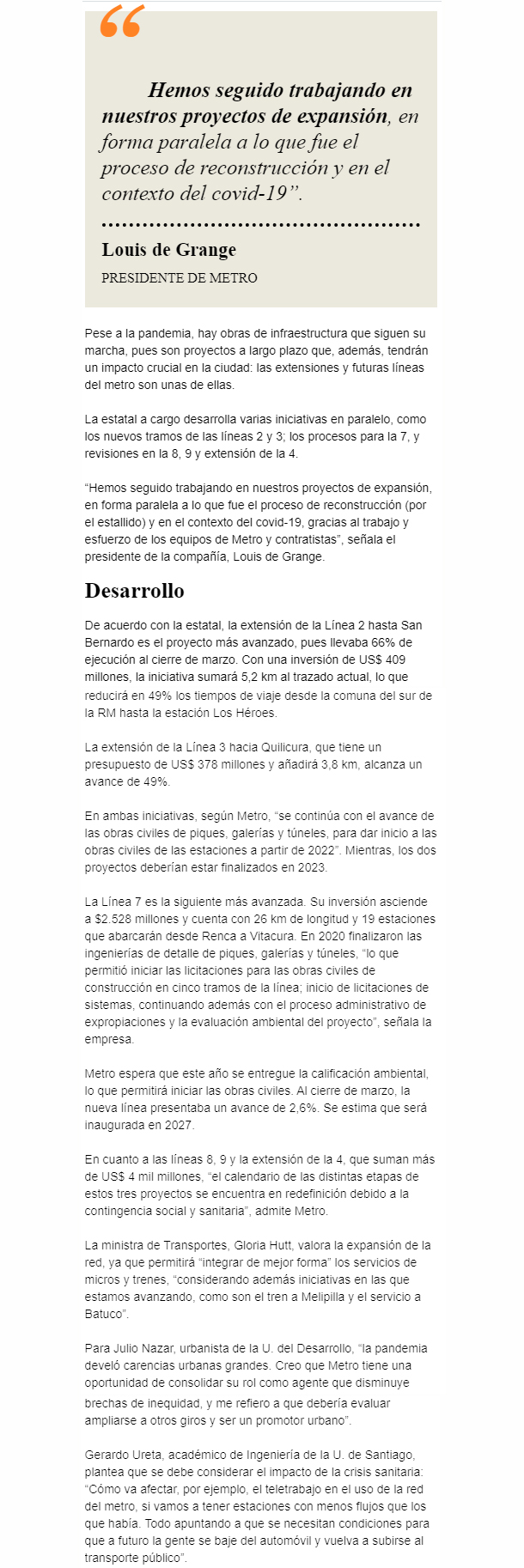 EL MERCURIO – 66% de ejecución física tiene el proyecto más avanzado: la extensión de la Línea 2 hasta San Bernardo que estará lista en 2023.