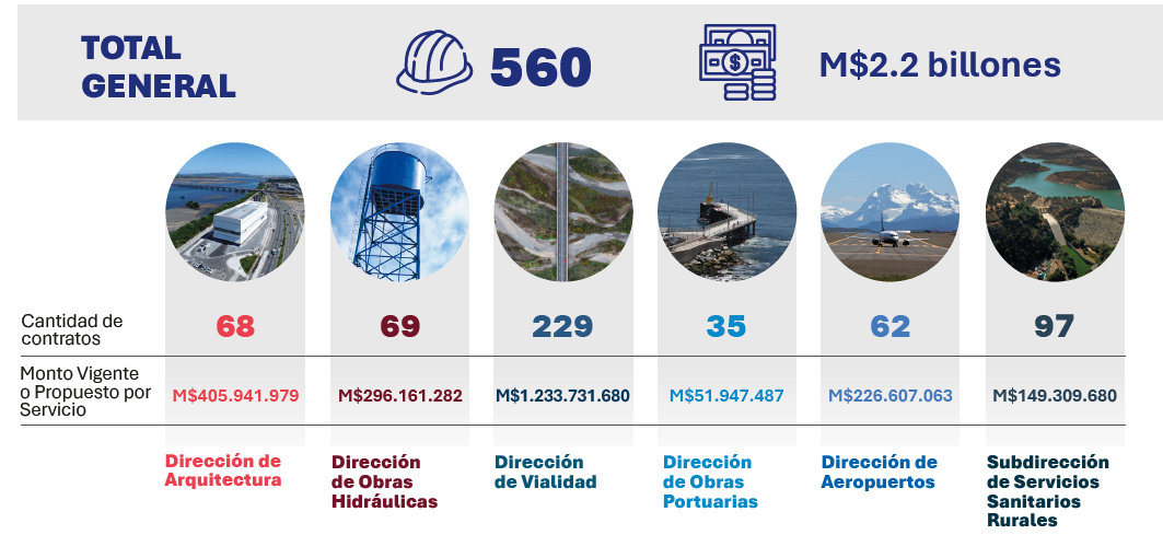 Las licitaciones presentadas corresponden a proyectos que abordará el MOP a través de la dirección de Arquitectura, Obras Hidráulicas, Vialidad, Obras Portuarias, Aeropuertos y la Subdirección de Servicios Sanitarios Rurales.