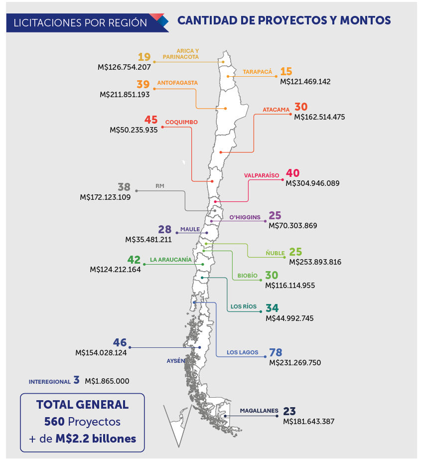 Las regiones con mayor inversión son Valparaíso, Los Lagos y Magallanes, jerarquizadas según la cantidad de contratos por licitar.