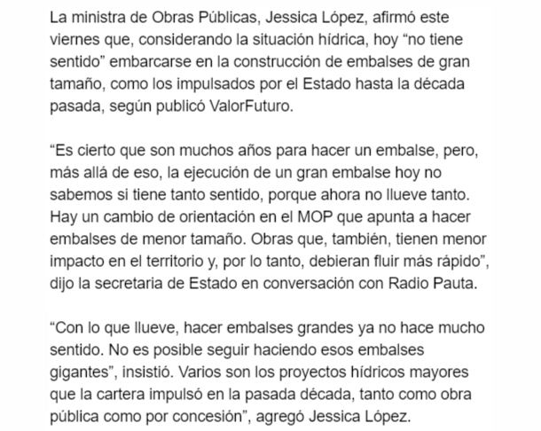 EL MERCURIO – La autoridad está por embalses de menor tamaño, manifestó la secretaria de Estado.