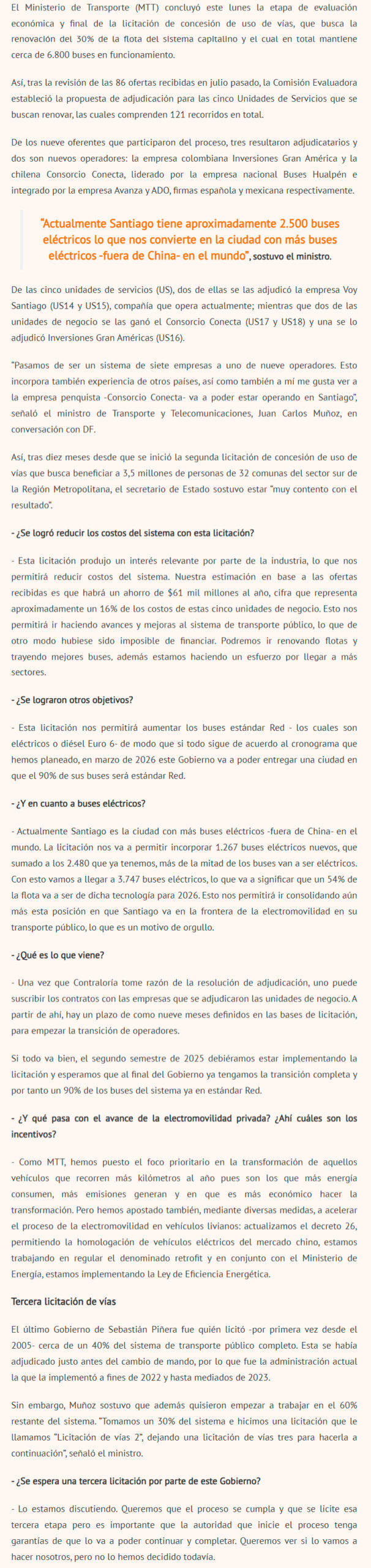 DIARIO FINANCIERO – Licitación permitirá que nueve de cada 10 autobuses sean eléctricos o a base de diésel Euro 6, además de generar un ahorro anual de $61 mil millones