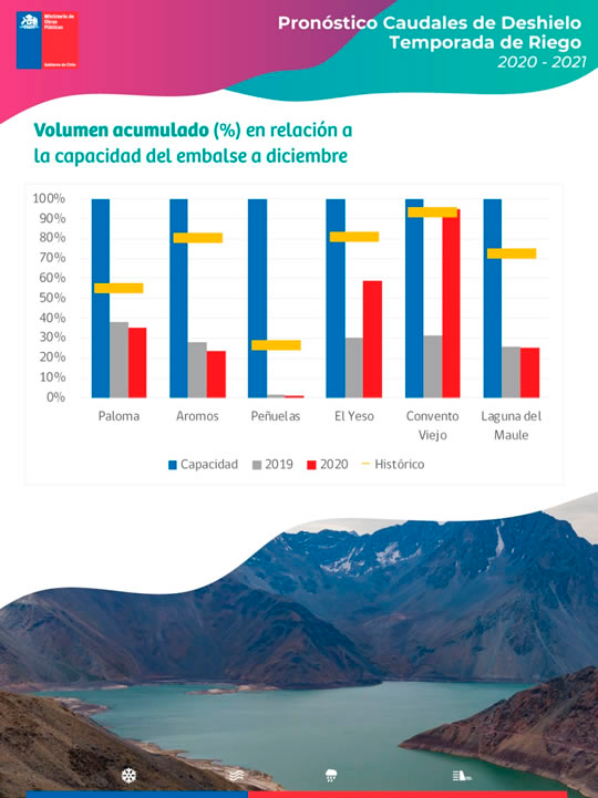 En el caso de los 25 embalses monitoreados por la Dirección General de Aguas, entre Coquimbo y el Maule hay un volumen almacenado levemente inferior a 2019, con dos excepciones: El Yeso en la Región Metropolitana y Convento Viejo en O’Higgins. El resto de los embalses está al 44% de su capacidad, lejos del registro histórico que es de 70%. La situación más preocupante la vive Los Aromos en Valparaíso que sólo alcanza 8,3 millones de m3 y su promedio histórico es de 28,3.