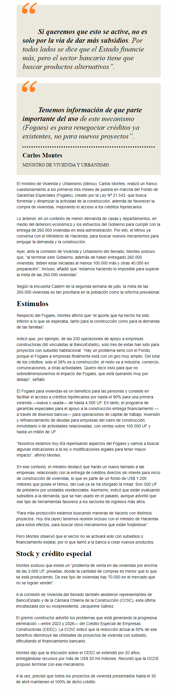 EL MERCURIO – La cartera evalúa cambios al Fogaes y activar subsidios a la demanda. Prevé otorgar más préstamos a empresas que inicien obras habitacionales.