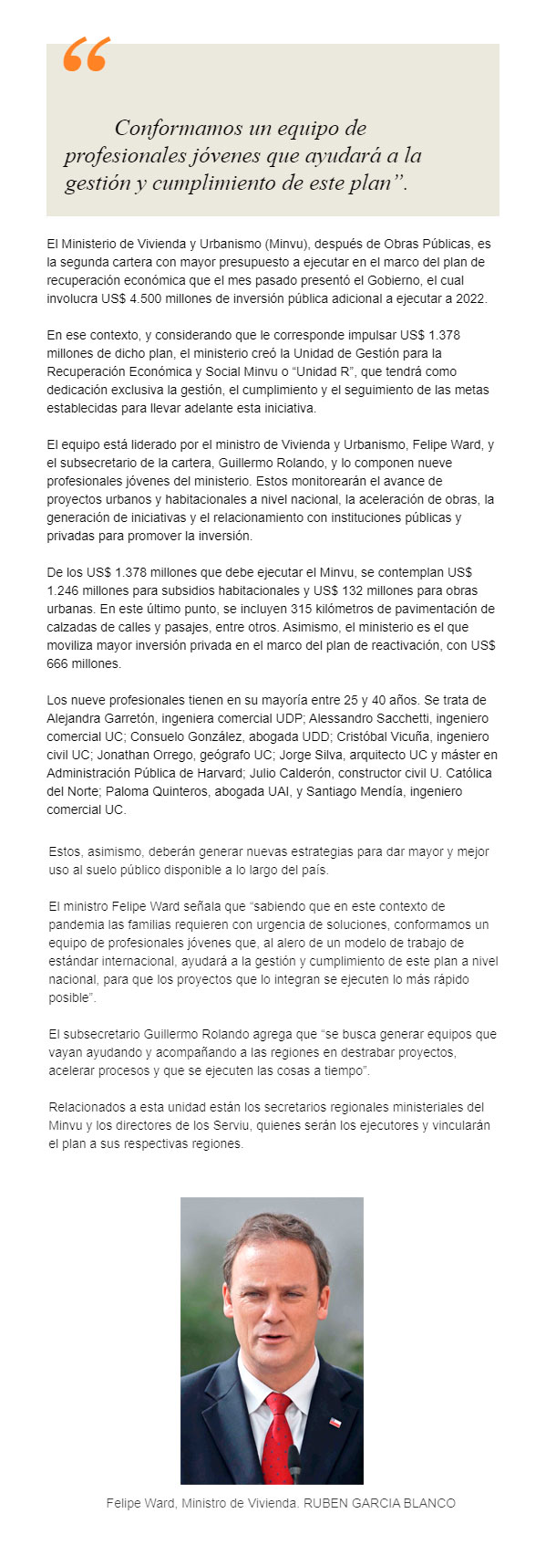 EL MERCURIO – El equipo debe monitorear el avance de proyectos urbanos y habitacionales a nivel nacional, la aceleración de obras y el relacionamiento con instituciones públicas y privadas para promover la inversión.