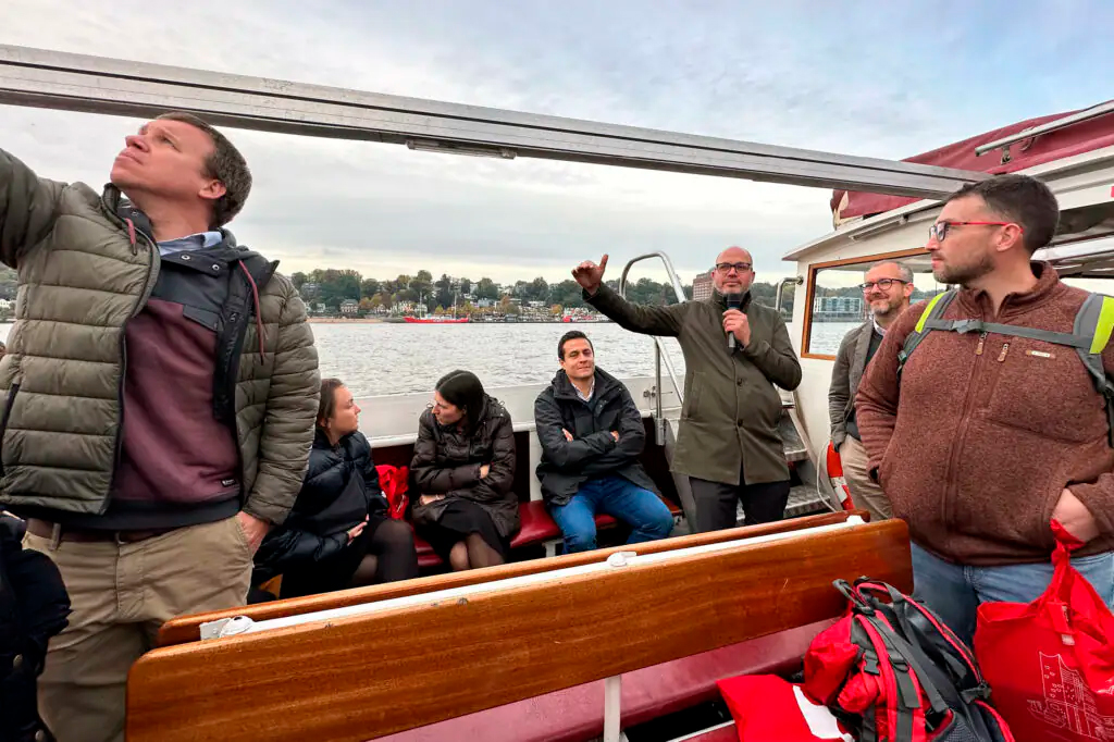 Cerramos la jornada con una visita al área del Puerto de Hamburgo, guiados por Christoph Schoppmann, Jefe de Planificación de Terminales y Logística – Intermodal en HPC Hamburg Port Consulting GmbH, con quien pudimos apreciar las distintas naves, grúas y movimiento de variados containers.