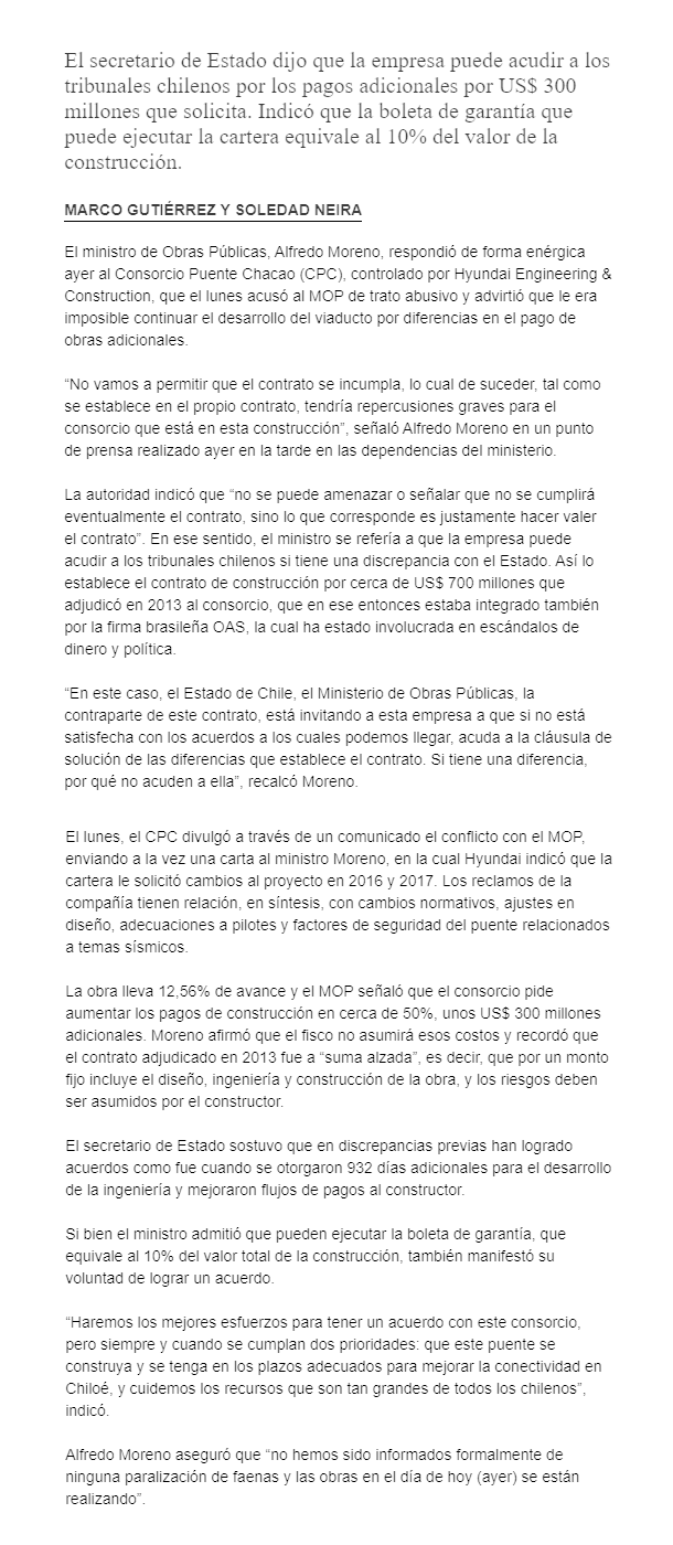 MOP advierte a Hyundai de “repercusiones graves” si incumple contrato de obras de puente Chacao