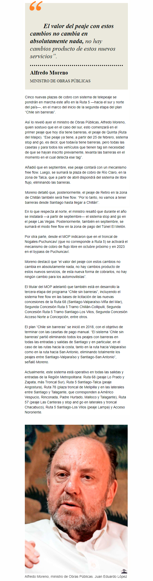 EL MERCURIO – Se trata de la implementación de la segunda etapa del plan “Chile sin barreras”, que comenzó en 2018. El ministerio indicó que corresponderán a sistemas free flow y stop and go.