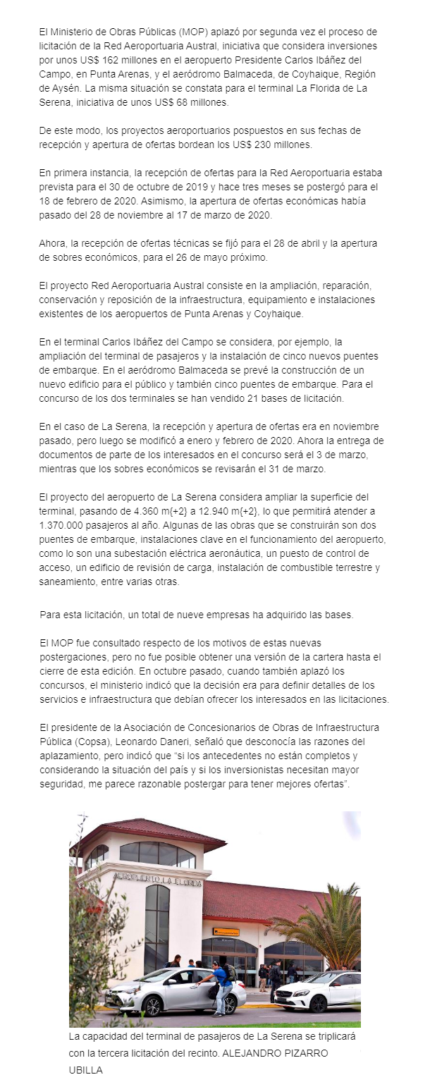 MOP aplaza por segunda vez licitaciones de aeropuertos en La Serena, Aysén y Punta Arenas