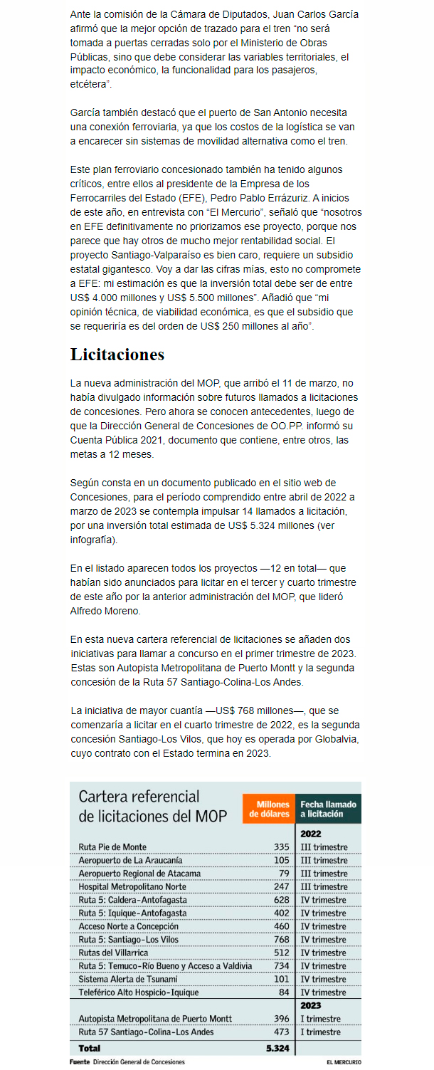 EL MERCURIO – El ministerio espera contar a mediados de este año con los estudios de los trayectos de las dos propuestas privadas que prevén conectar la Región Metropolitana con los principales puertos de la zona central.