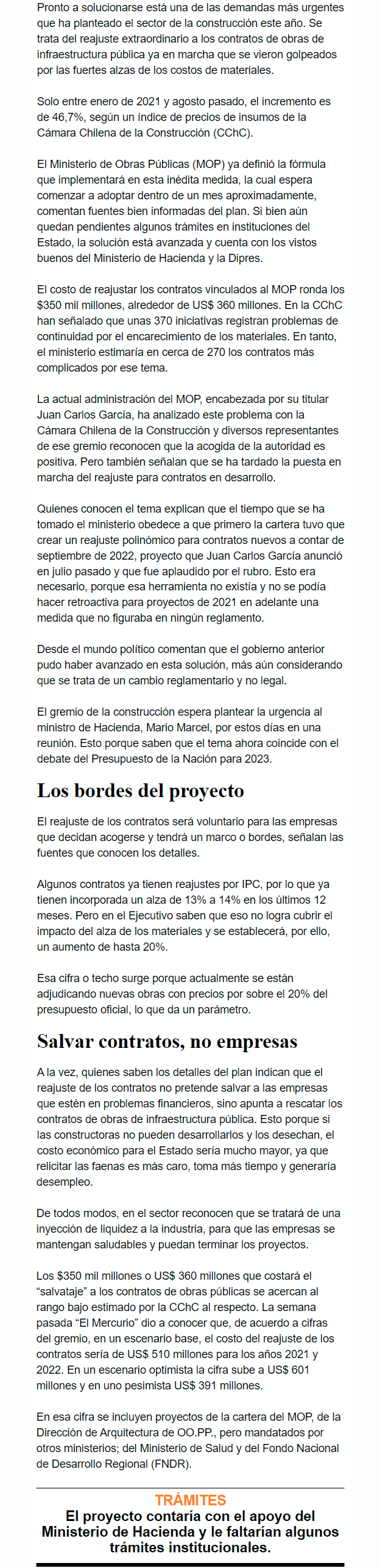 EL MERCURIO – La iniciativa reconocería un incremento máximo de 20% para proyectos que partieron en 2021 en el caso de que las constructoras opten por acogerse a este inédito programa que busca salvar el desarrollo de obras de infraestructura.
