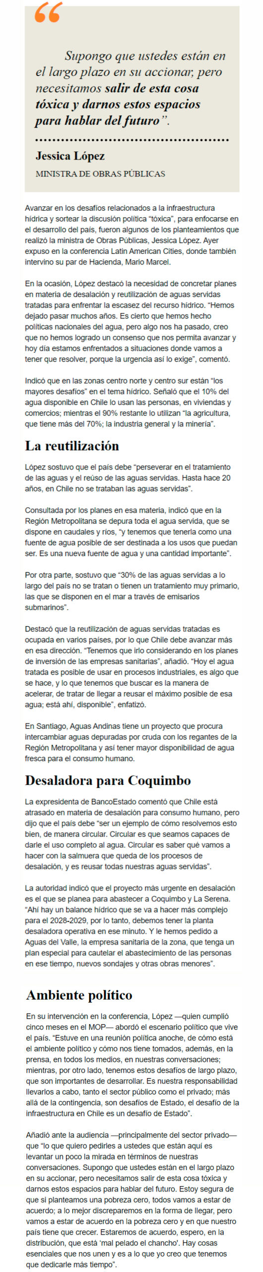 EL MERCURIO – Plantea ampliar la utilización de estas aguas tratadas y rescatar las que aún van a dar al mar a través de emisarios submarinos.