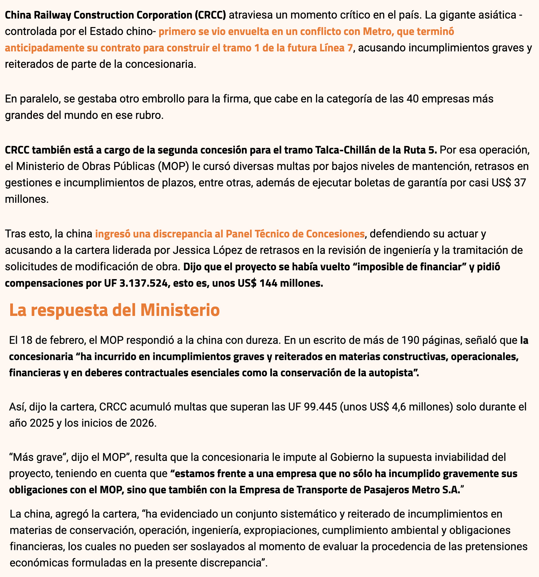 DIARIO FINANCIERO – El 18 de febrero, el MOP respondió a la china con dureza. En un escrito de más de 190 páginas, señaló que la concesionaria “ha incurrido en incumplimientos graves y reiterados en materias constructivas, operacionales, financieras y en deberes contractuales esenciales como la conservación de la autopista”.