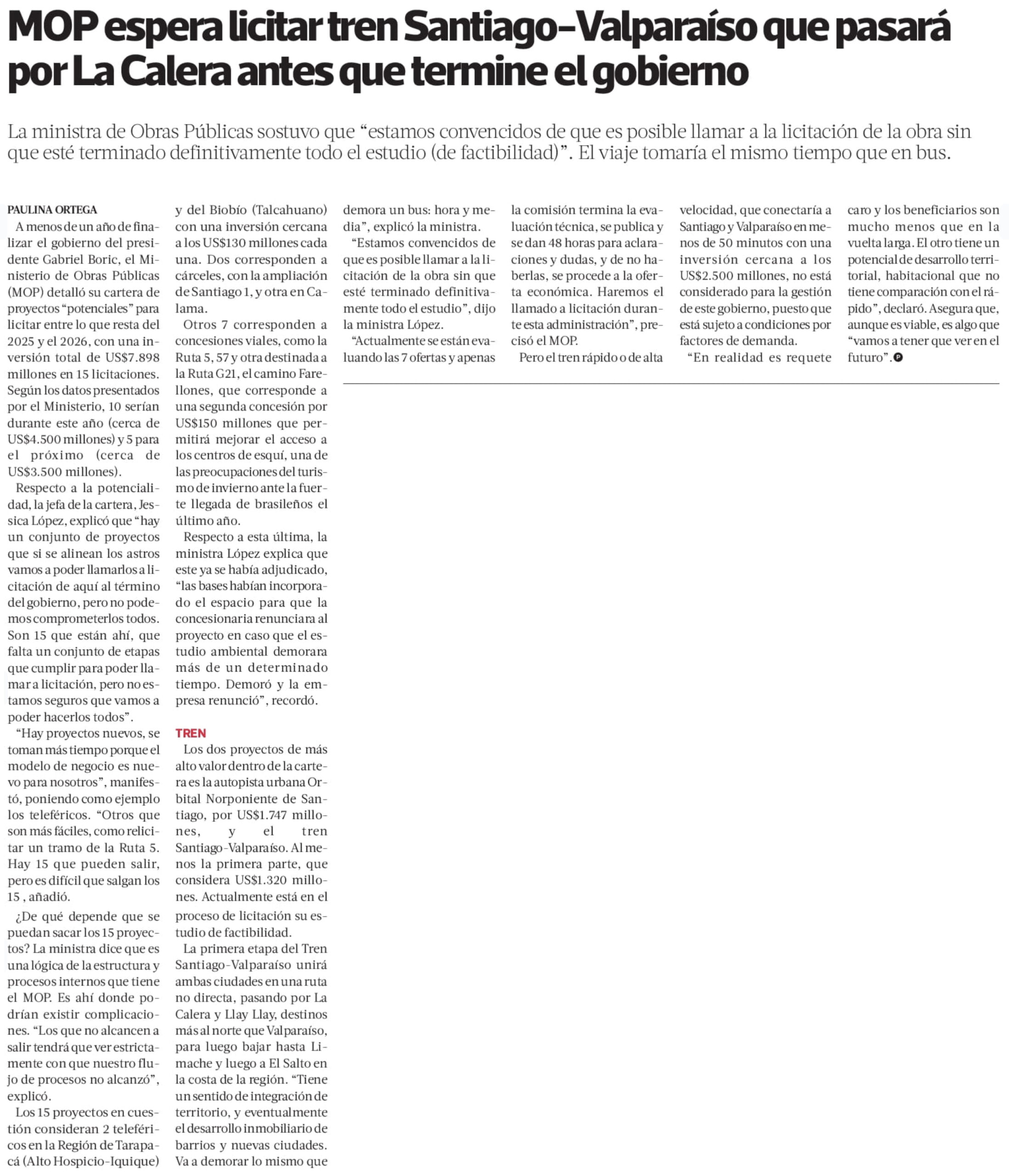 PULSO – La ministra de obras públicas sostuvo que “estamos convencidos de que es posible llamar a licitación de la obra sin que esté terminado definitivamente todo el estudio (de factibilidad)”. EL viaje tomaría el mismo tiempo que en bus.