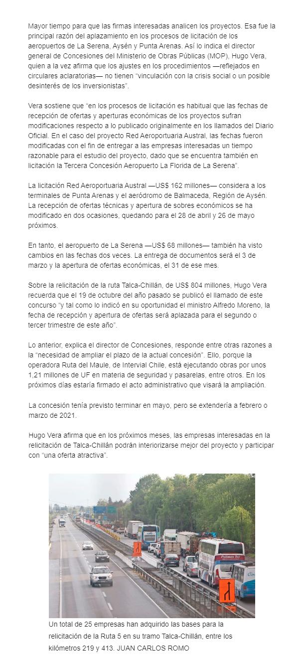 MOP explica aplazamiento en aeropuertos y ajustes en Talca-Chillán