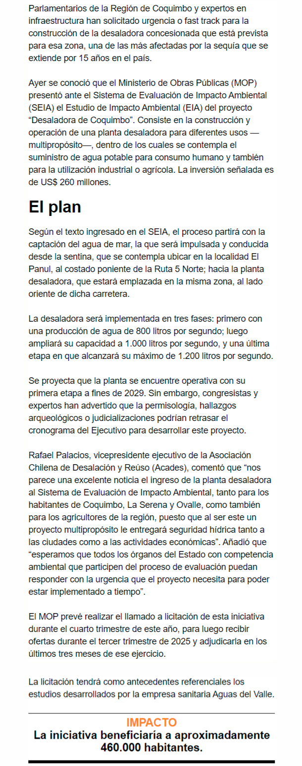 MOP inicia tramitación ambiental para una desaladora en Coquimbo con inversión de US$ 260 millones