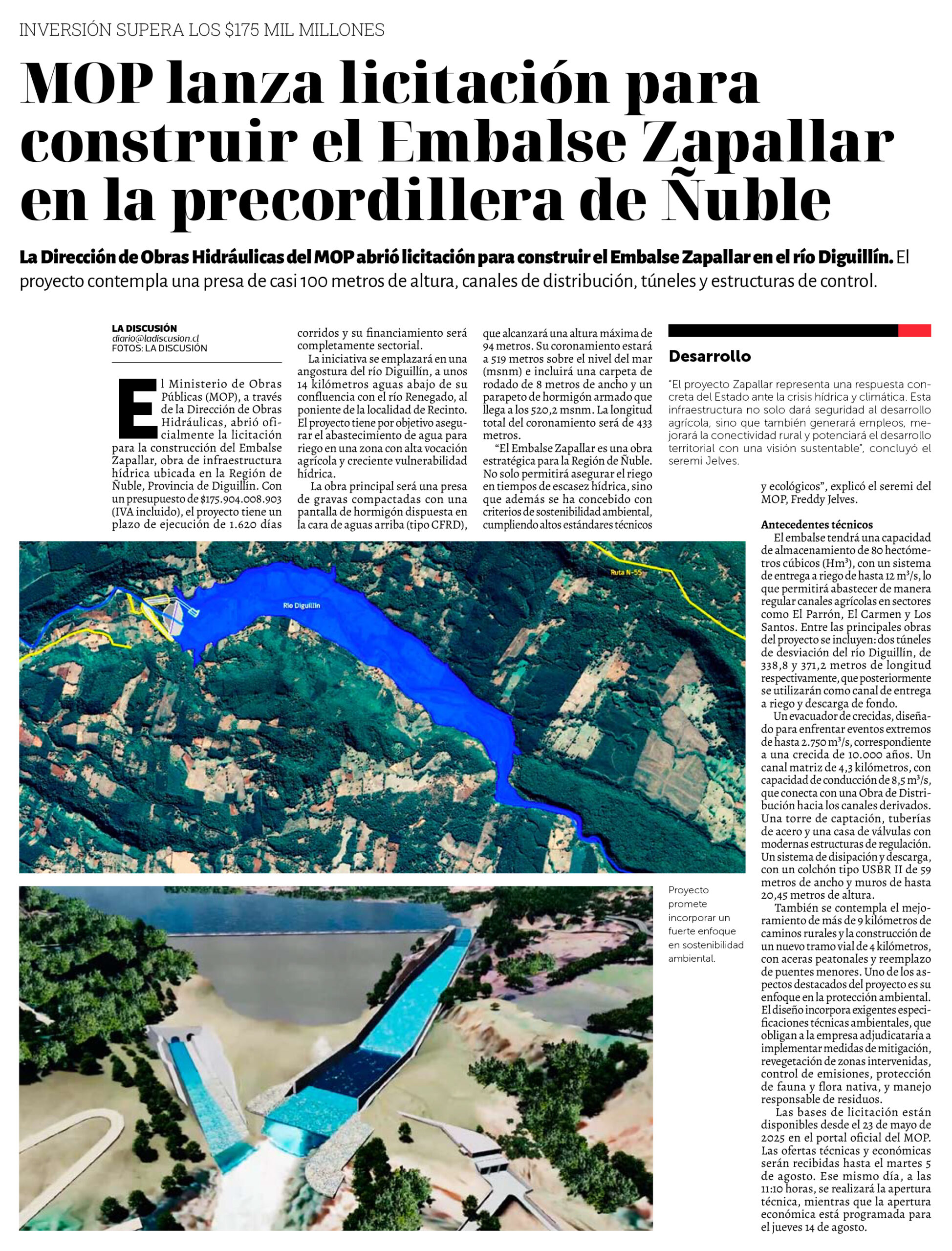LA DISCUSIÓN – La Dirección de Obras Hidráulicas del MOP abrió licitación para construir en el río Diguillín. El proyecto contempla una presa de casi 100 metros de altura, canales de distribución, túneles y estructuras de control.