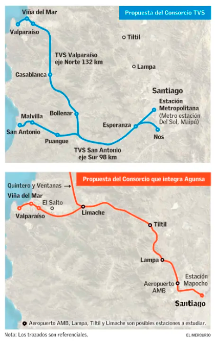 Una de esas firmas será la encargada de analizar el proyecto Tren Valparaíso Santiago (TVS), de unos US$ 2.400 millones, que impulsa el consorcio integrado por Sigdo Koppers (SK) y China Railway Group Limited (CREC), que llegaría desde la capital a San Antonio y Valparaíso. Y también la propuesta de US$ 2.000 millones “Conexión ferroviaria Santiago-V Región”, que considera un tren de carga y de pasajeros desde Santiago a Valparaíso —no a San Antonio— y que propone el consorcio Iniciativas Privadas, donde participa Agunsa.