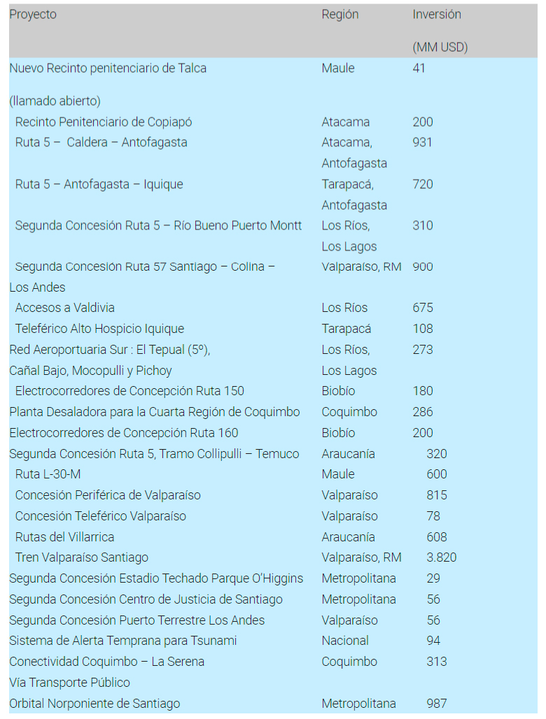 Entre los llamados a licitación destaca a proyectos Sistema de Alerta de Tsunami, Ruta 5 tramos Iquique-Antofagasta y Caldera-Antofagasta, así como la red de electrocorredores de Concepción en rutas 150 y 160, el teleférico de Alto Hospicio-Iquique, la desaladora de Coquimbo y los recintos penitenciarios de Talca y Copiapó.