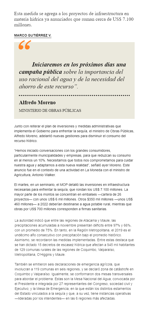 EL MERCURIO – Esta medida se agrega a los proyectos de infraestructura en materia hídrica ya anunciados que suman cerca de US$ 7.100 millones