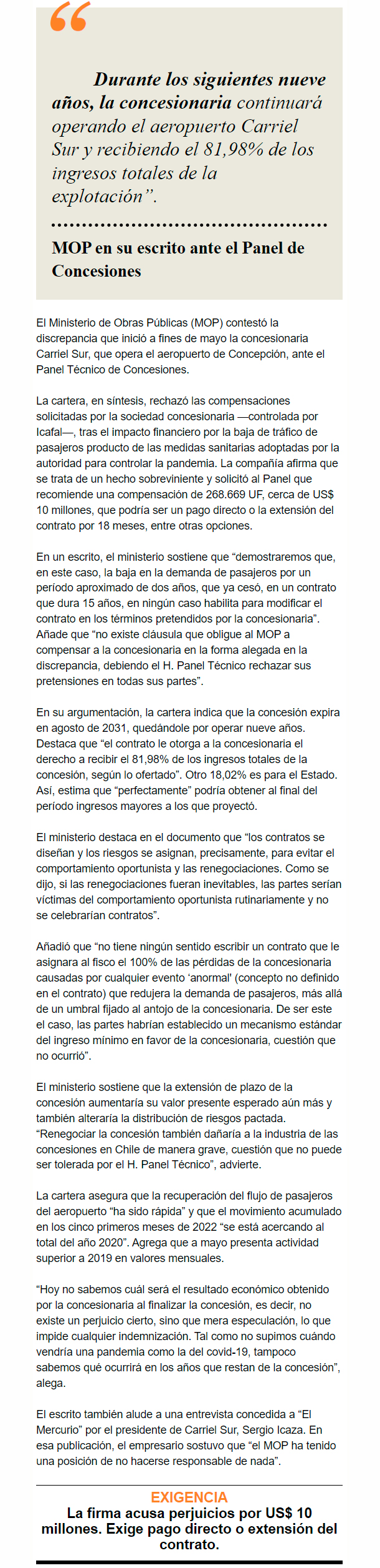 EL MERCURIO – Renegociar la concesión también dañaría a la industria de las concesiones en Chile de manera grave.