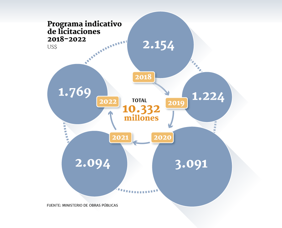 En 2020 se estipulan siete proyectos con una inversión de US$ 3.091 millones; el 2021 se serán otros siete con recursos por US$ 2.094 millones, y el 2022 una cartera de siete iniciativas más por US$ 1.769 millones.