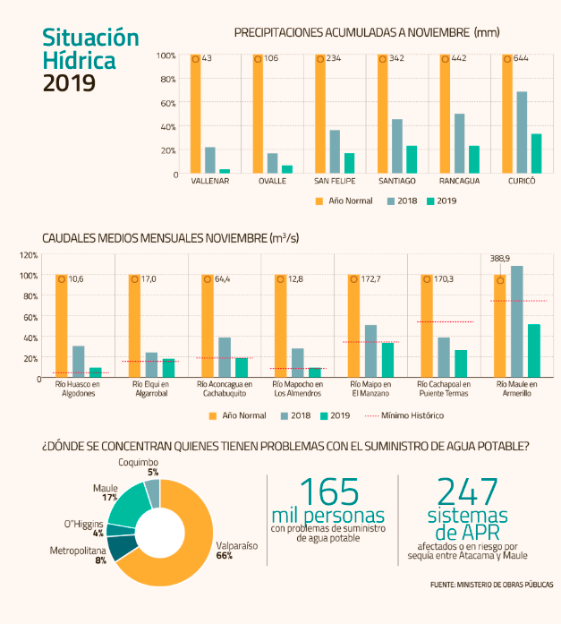 Por lejos los lugares más afectados han sido donde existen sistemas de Agua Potable Rural (APR). De los 2.800 sistemas, hay 1.339 que se ubican en una región con emergencia hídrica.
