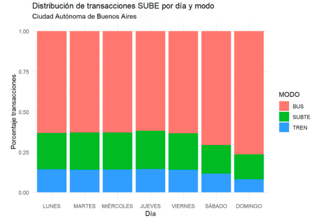 En cuanto a la distribución modal, la misma se mantiene estable de lunes a viernes alrededor del 62%, subiendo levemente los sábados, mientras que los domingos prácticamente un cuarto de los viajes en CABA se efectúa mediante colectivos. El medio de transporte que más terreno pierde los domingos es el subte, medio de transporte más caracterizado por su uso laboral (por su fuerte conexión con el microcentro porteño).