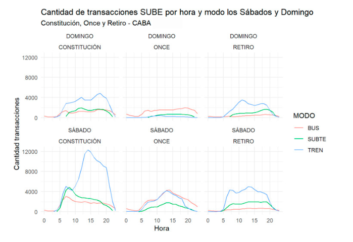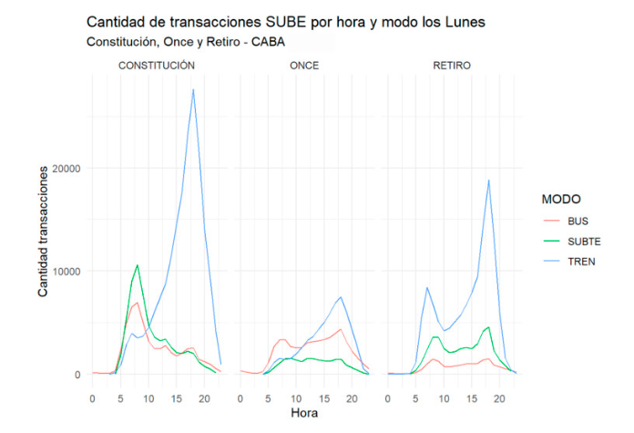 En consonancia con esto, el subte y el colectivo poseen sus picos en Constitución por la mañana, tal vez debido a la enorme cantidad de gente que combina el tren con otro medio de transporte para continuar su viaje. A lo largo del día el Subte y el Colectivo se van apagando mientras que el tren incrementa exponencialmente la cantidad de transacciones. Con magnitudes invertidas, Once y Retiro presentan comportamientos similares en cuanto a Subte y Colectivo, con picos a la mañana y a la tarde y leves repuntes por el mediodía, algo similar al nivel general de la Ciudad.