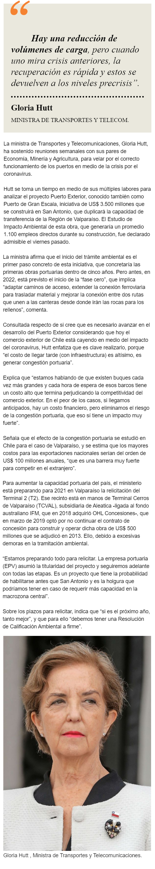 EL MERCURIO – La ministra de Transportes, Gloria Hutt, explica que si no se amplia la infraestructura, se generará congestión y repercutirá en mayores costos para las exportaciones.
